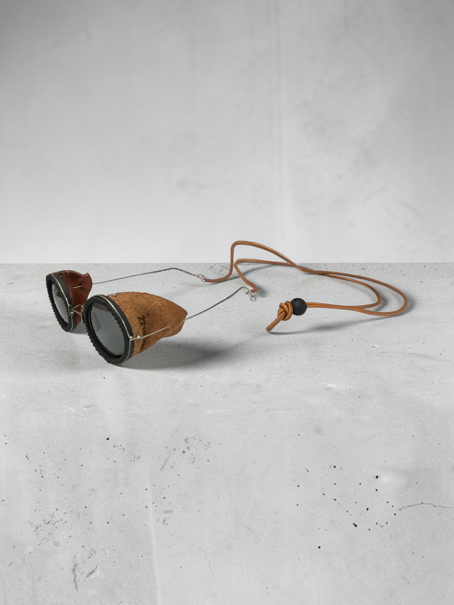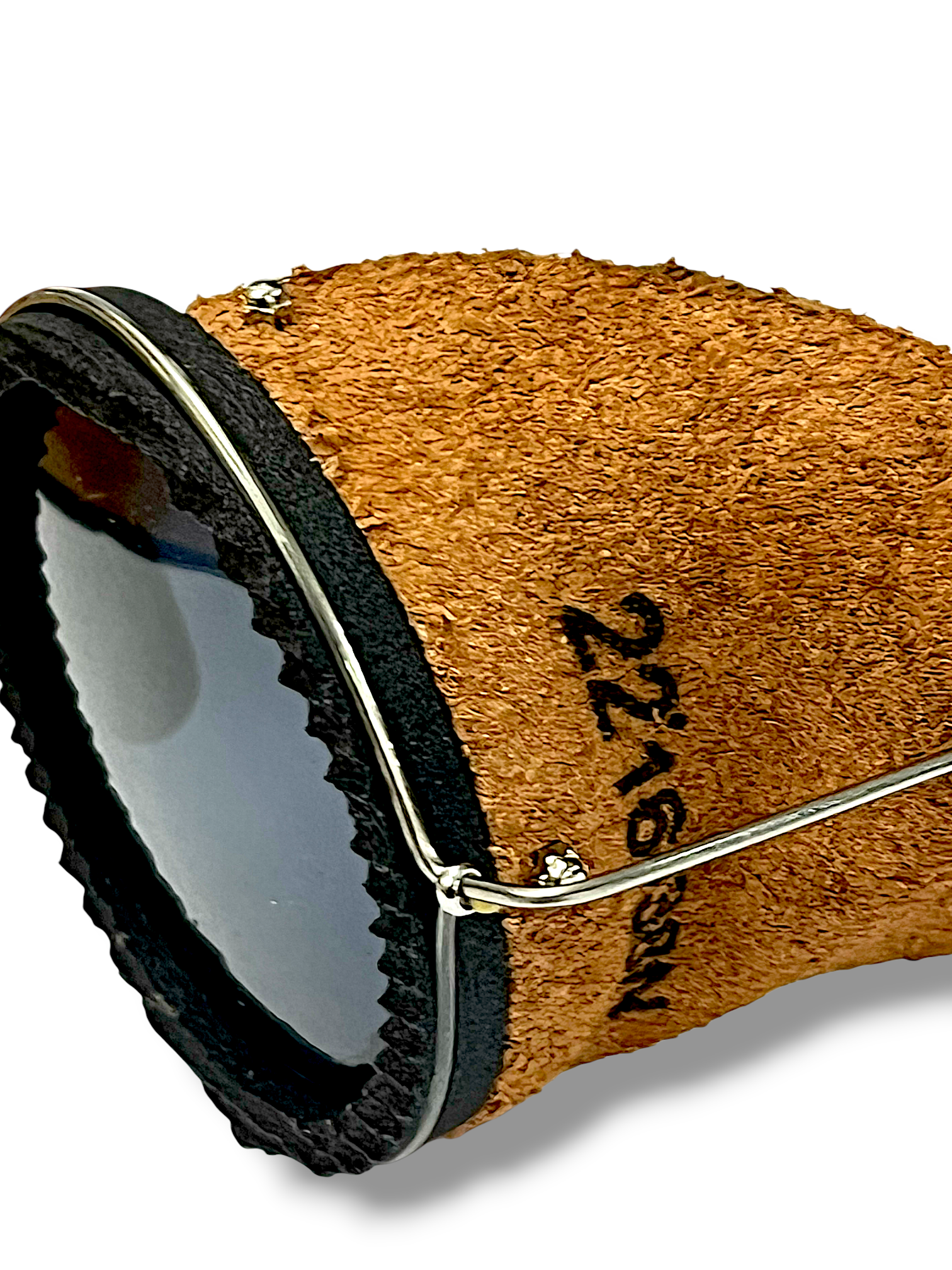 This sideshell wind-shield style sunglasses have been reimagined through a fusion of cutting-edge technology and handcrafted techniques. Crafted from titanium and genuine buffalo leather, they offer both comfort and durability. The ultimate luxury of their construction is harmonized with a natural aesthetic, striking a renewed balance between elegance, comfort, and nature.